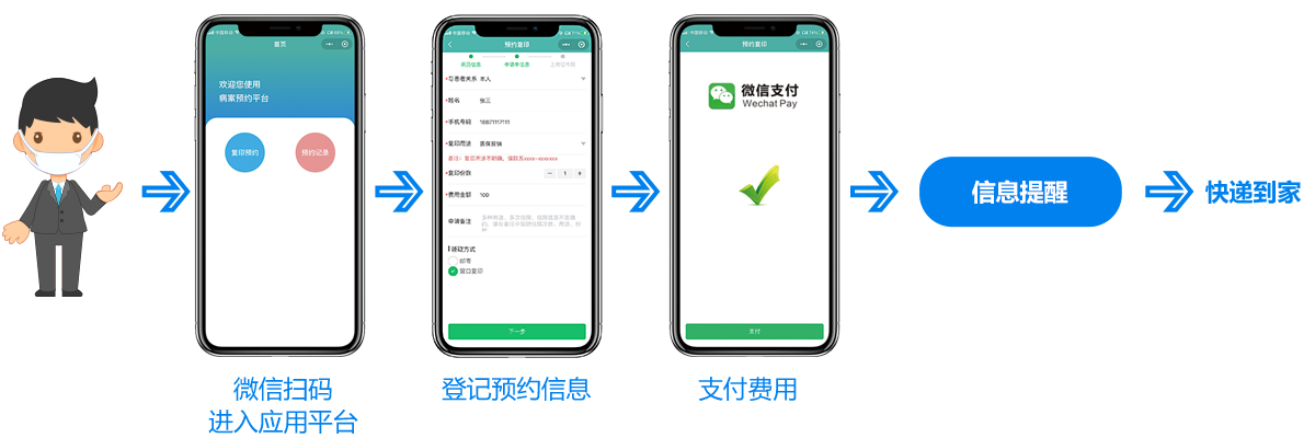在线填写患者住院信息,选择患者关系、复印用途、上传身份照片信息,提交病历复印申请及支付,在病历复印整个过程中,有专职客服解答您的问题咨询。病历复印完毕,根据现场叫号显示屏或微信通知的提醒,在医院病案室窗口提取;线上预约将会收到微信发出的邮寄通知,可实时查看快递踪迹,等待快递到家。